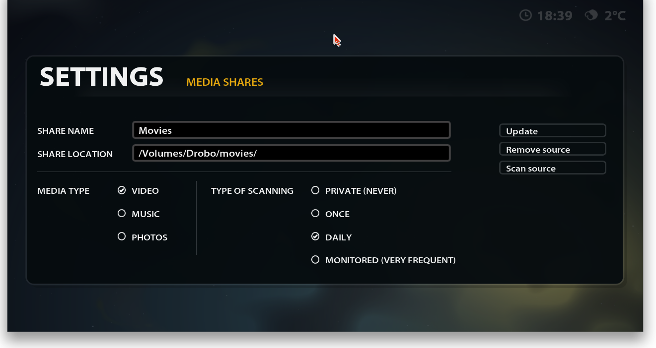 Lots of internet video is all well and good but my main interest is in my locally stored content. Boxee makes it easy to add content compared to Plex. Visit the Settings screen, Media and then you can browse to a local drive or a network share or enter the source manually. Like Plex when entering a source you select a content type – video, music or picture. You can then alter how often the folder is scanned for new content – private, once, daily or monitored which means newly acquired content should be available quickly from within Boxee.