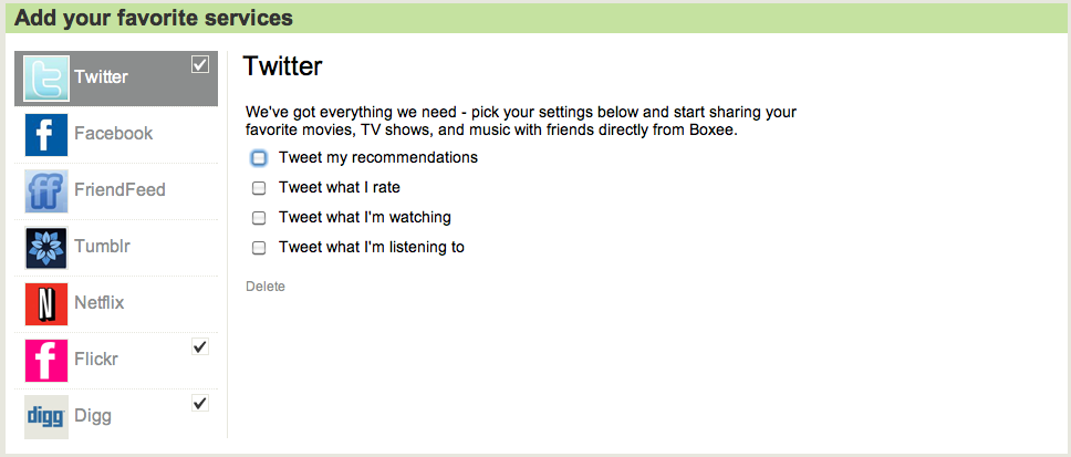 One of the first differences with Boxee is to download the application you first need to create an account. The account you setup isn’t just for downloading the application – it’s the key to sharing your media likes amongst friends. On the website you can add friends who already use Boxee, see what your friends have been watching and recommending and also link your account to other services.