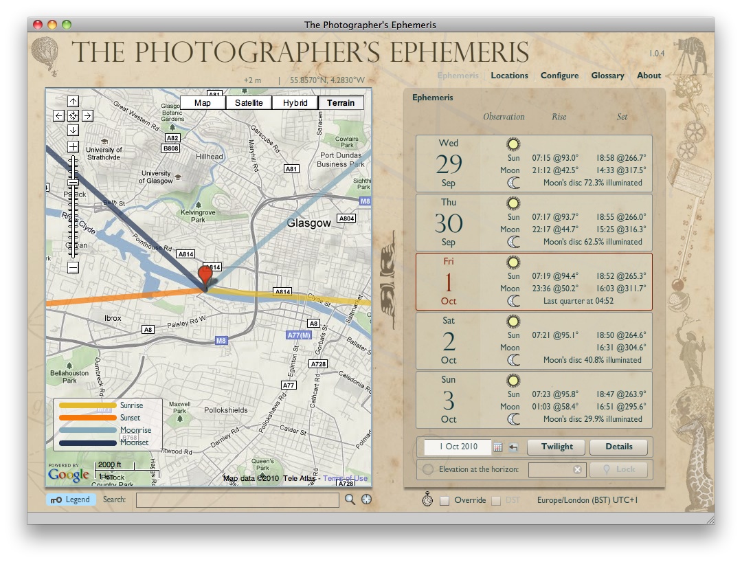 Photographer’s Ephemeris is free and is an Adobe Air application so is multi platform. It’s easy to install and use and the results are great. Alongside the Air application a version has been written for iOS devices. This however is not free, currently retailing for £5.49 in the UK. This version is iPhone only at the moment but an update is coming which will move the application to being universal with iPad support.