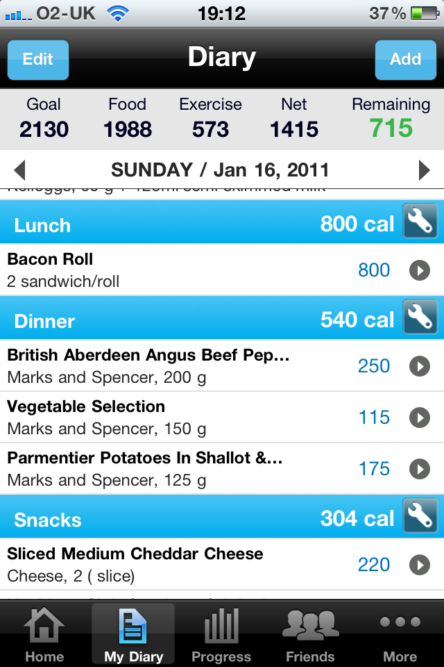 Overall I like the service myfitnesspal offers purely due to the functional rather than pretty front end making it easy to add data and the very complete food database. The fact it’s free is another plus point but I would be interested in hearing from anyone using a similar service that they would be happy to recommend.