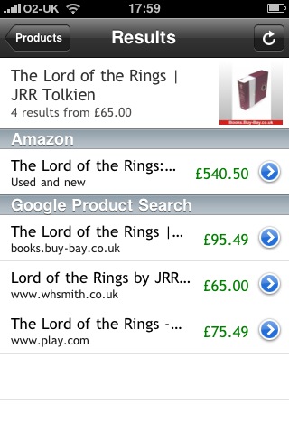 RedLaser is a wonderful iPhone app available on the app store for, currently, £1.19. It works remarkably well and is extremely accurate. The app uses the built-in iPhone camera to scan barcodes on products. Once a barcode has been recognised by the app, it searches for the product on Amazon and Google and returns back a list of prices in order to provide a possible cheaper price. Each item in the list can be clicked to view full product details from the merchant’s website, using the built-in browser.