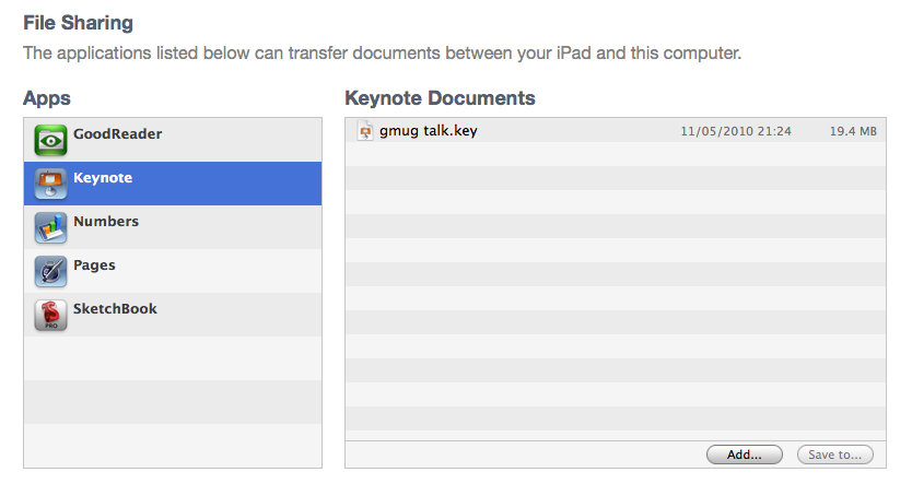 This is only available when the iPad is hooked up to your machine. It’s a clunky solution to file management and one that I hope is addressed soon. You can’t create folders of content, it’s not browsable from Finder and it screams out for something new. I can’t believe that the Apple iPad apps (Keynote, Numbers and Pages) don’t have some built in synchronisation to Mobile Me, never mind to something like DropBox. GoodReader allows you to connect wirelessly to a PC or Mac and content can then be uploaded with ease – why can’t Apple offer that as a default option for all app’s? In fact, where is wireless sync?