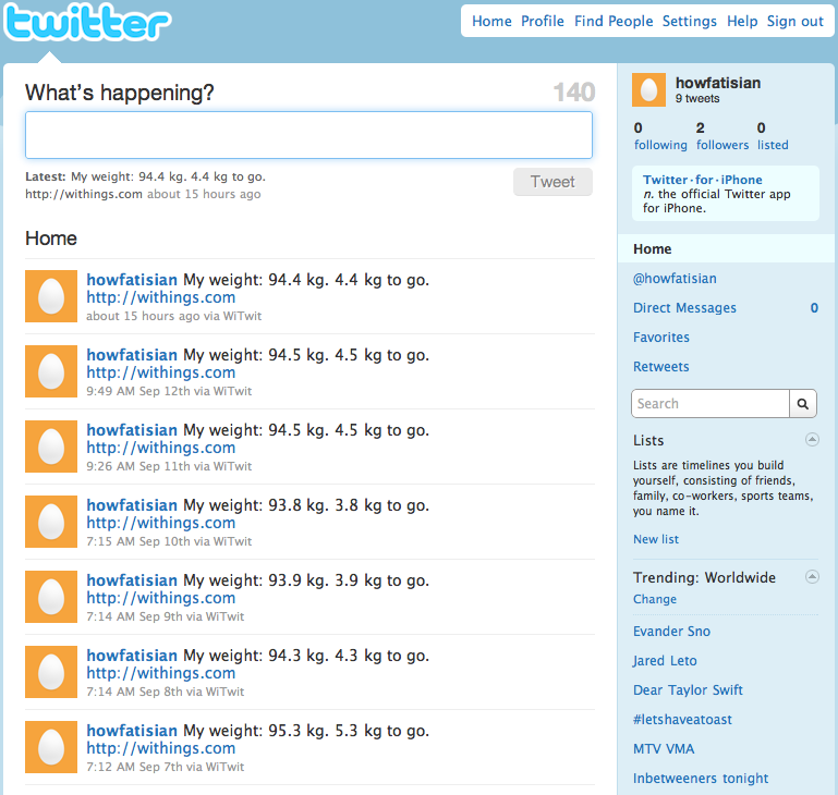 As it’s all automatic it means I can track my weight daily. Total overkill but it’s part of the new weight strategy – track all inputs and outputs. Track weight, exercise and calorie intake. Withings also make sharing information really easy with a number of options available. I can publish my data on the web via a link or an iFrame. I can also share my data with other users who can access via an e-mail address. I can also link Withings to a number of other accounts – Google Health, Runkeeper, even WeightBot on the iPhone. Finally, I can auto tweet my weight after each weigh in. No where to hide 🙂