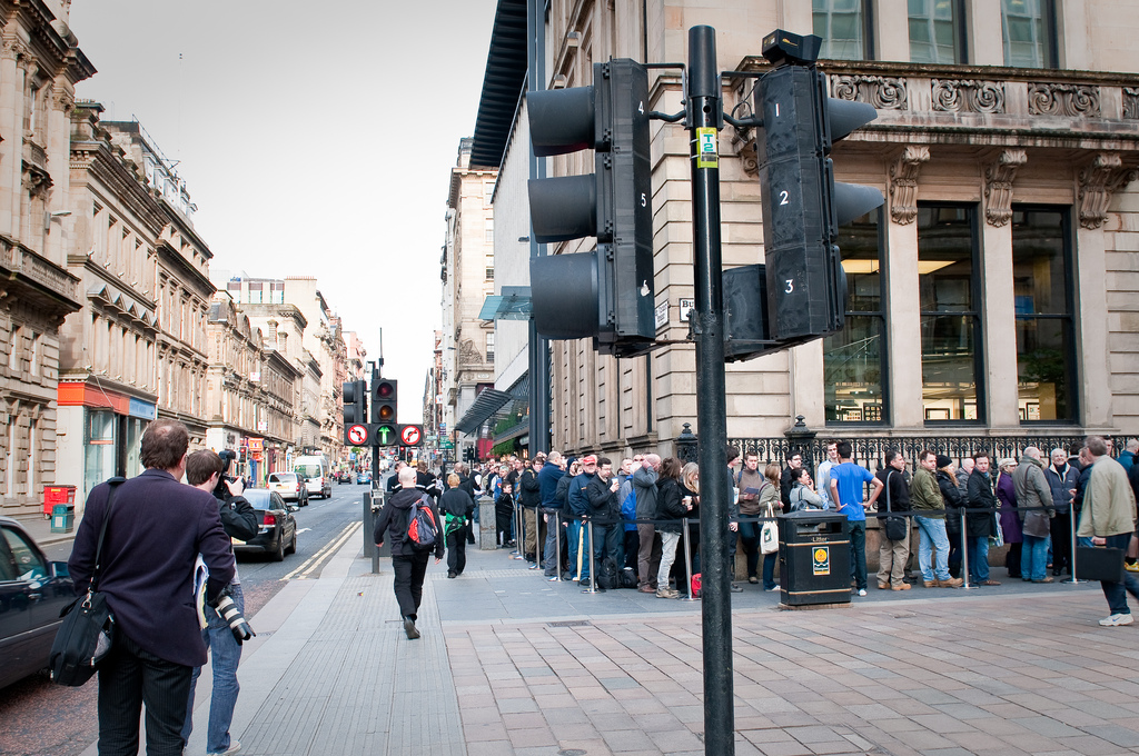 With the help of a Starbucks or two the time passed quite quickly. With five minutes to go the Apple staff did a run around the block whooping and a cheering. Fair play – it did help to build a bit of excitement but rather them than me. Then at 08:00 the doors were opened and we trooped in. Thankfully we were in the first 50 so got some heat. I was surprised how quickly people were served and we were both out of the store by 08:30 with our 64GB 3G iPads. I should note that the buying experience was pretty unique. We were brought into the store and each customer got an individual personal shopper who introduced themselves, asked what we were looking for, ran around (literally) to pick up any accessories we may have wanted and them completed the purchase. No hard sell of insurances, add-ons etc. A big well done the the team at Glasgow Apple store as it looked to go incredibly smoothly.