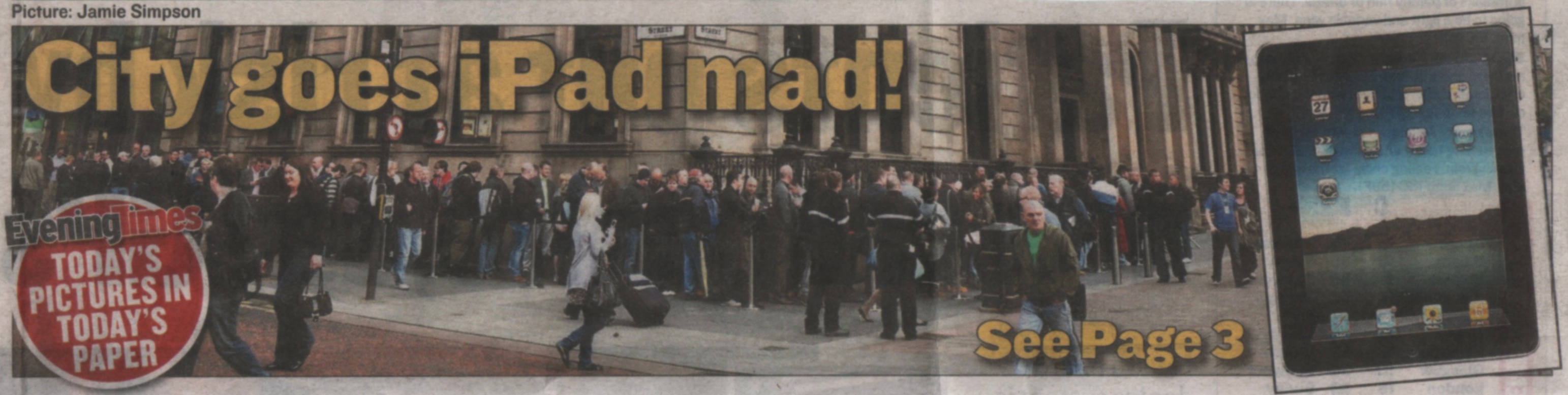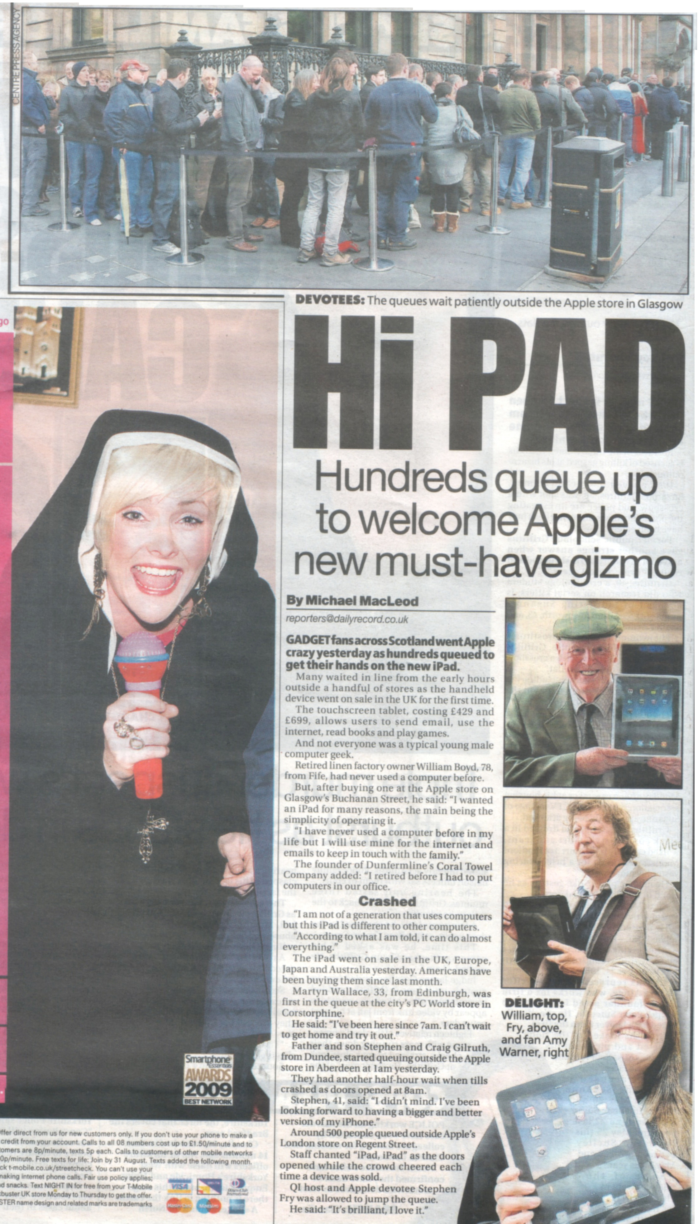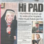 Another aspect of the shopping experience – Apple store employees were more than happy to pass you on to an expert who would take you through the setup of your iPad, how to use it and how to get the best out of it. You don’t get that at PC World (although you could also buy the iPad on launch day from there if you wanted). I declined as I wouldn’t get to play with the iPad for another 12 hours or so due to a works outing. Thankfully we did take a holiday on Friday as our photo appeared in many papers on Friday and Saturday. Geek fame. By all accounts sales were pretty brisk in the UK which I didn’t really expect. Also surprised that 3G models seem to be most popular.