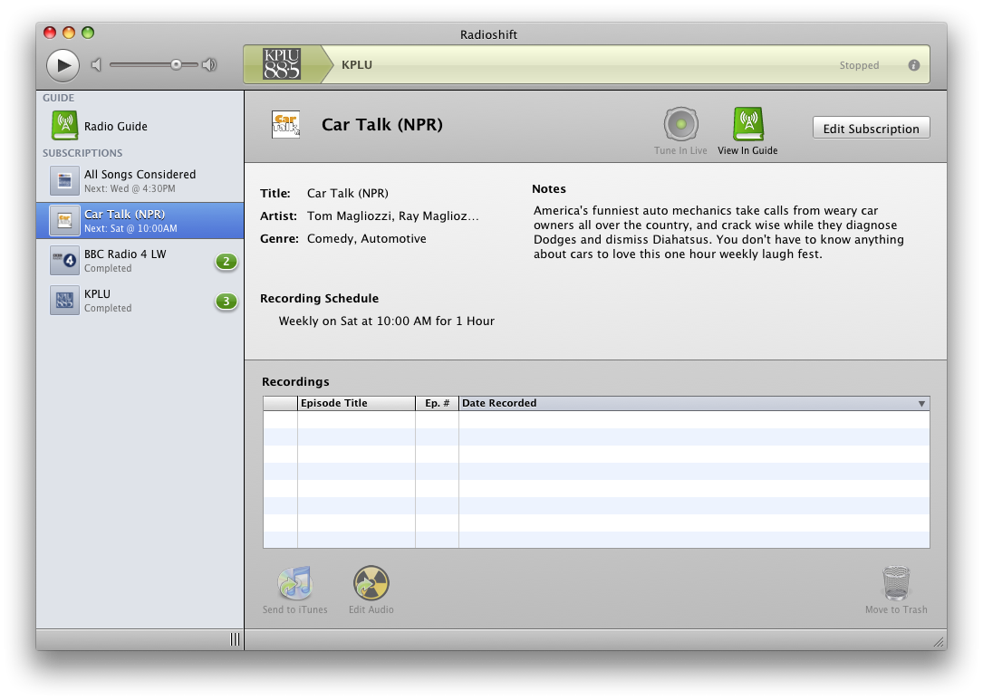 The guide is impressive and had a lot of UK content although some of the local stations didn’t have a show list. You also get to see what is popular now and filter stations by genre, location or by full text search. Playback is simple via the application which will also install any missing plugins to maximise the amount of stations it can support. There is no built in audio editor but Radioshift can hand off editing to any installed editor. You can also export audio into iTunes making it easy to listen to recordings on your iPod or iPhone.
