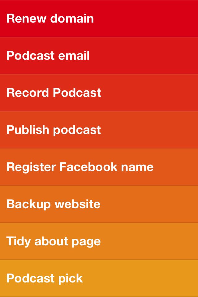 Create a top level list and then touch to enter it. Pinch out to add a new todo. Pinch out again to enter another. There are no start dates, due dates, contexts – none of that muck. It’s a simple list. To change priority touch and hold, then move up or down in the list. The colour and order is the priority. Swipe to complete, pinch in to collapse to the top list. Pinch in again and you get some very simple options. Realmac’s video is a great demo of the app.