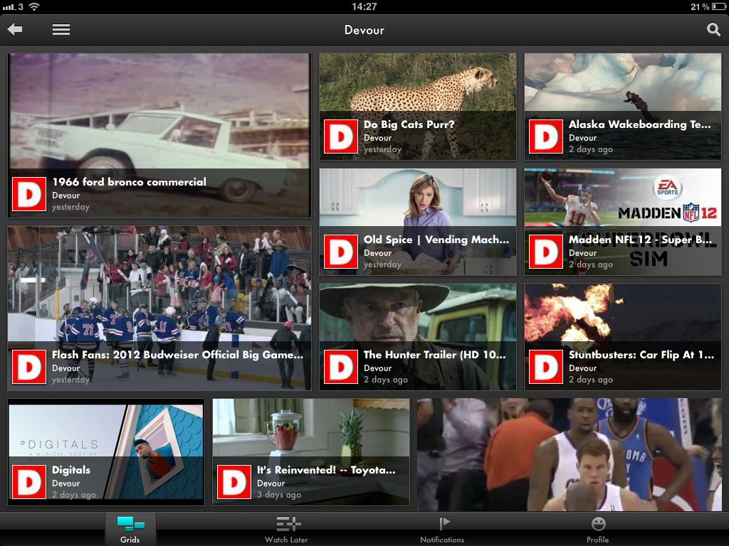 As well as channels, Showyou also lists content from many viral aggregators like Devour. It’s a great way to browse and view content rather than visiting the website on the iPad.